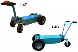 Les transporteurs électriques existent en 2 versions. Version avec guidons, l’opérateur est derrière la machine, le variateur de vitesse est rotatif sur la poignée droite et l’inverseur marche avant ou arrière est au tableau de bord. Version avec timon de commandes, l’opérateur peut être devant la machine le variateur de vitesse et l’inverseur marche avant ou arrière sont gérés par 2 basculeurs au pouce pour main droite ou main gauche.
