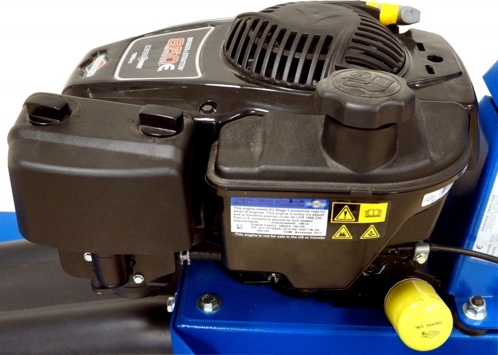 Moteur : B&S 850E – Monocylindre, 4 temps, refroidissement à air, OHV (soupapes en tête) 190 cc- 6cv – Cylindre chemisé fonte – Lubrification sous pression avec filtre à huile – Système d’allumage électronique Magnetron – Réservoir essence (Sp98) 1 litre